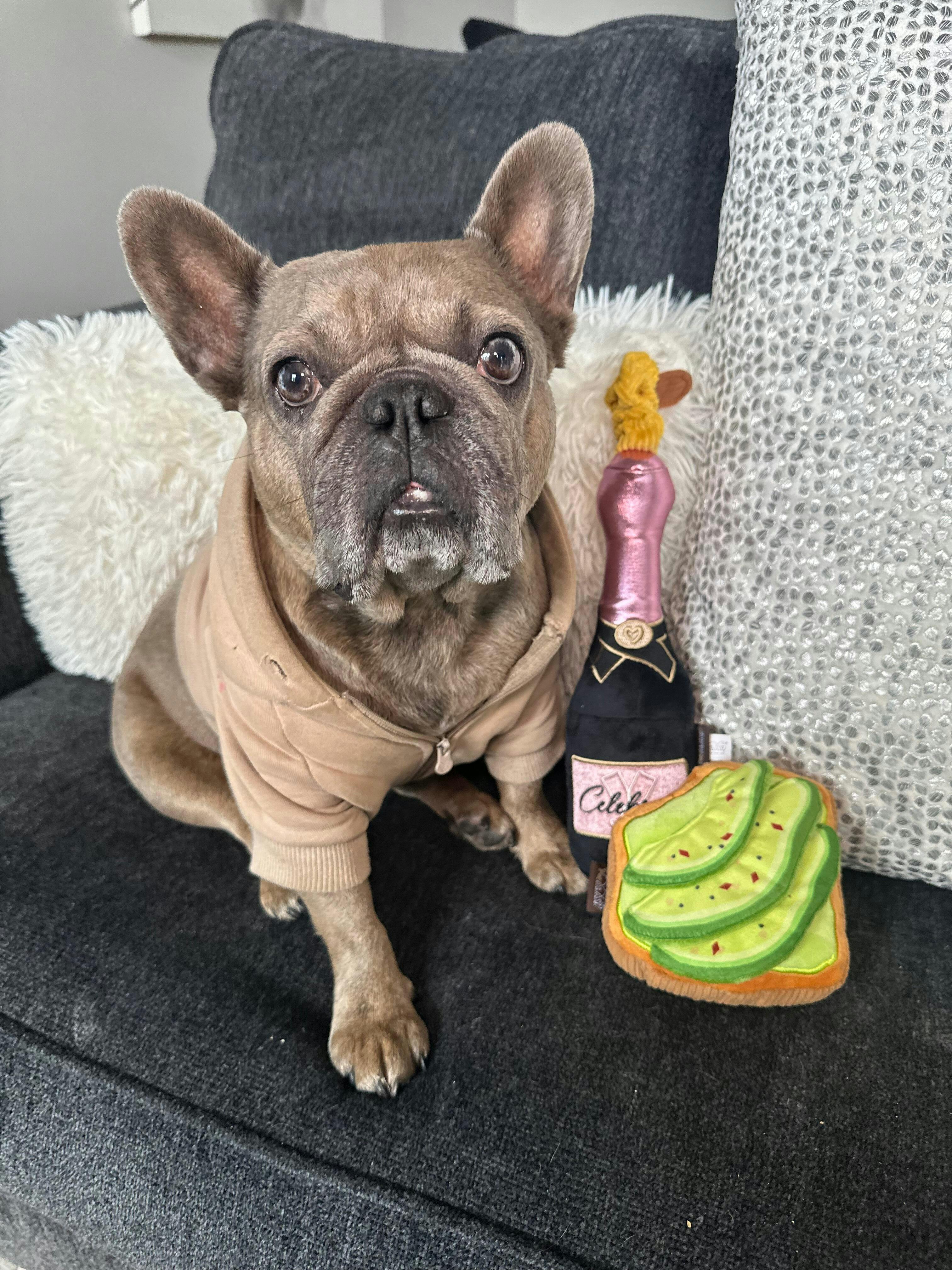 My pup has a tendency to chew through most toys, but the avocado toast is still alive and well! She absolutely loves it! The squeaker and the crinkle really entertains her and the toy is such good quality.