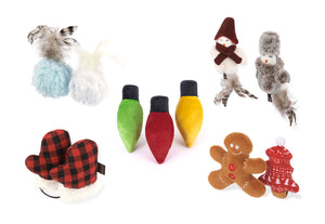 Illuminate your cat's holiday with P.L.A.Y.'s Feline Frenzy Kitty Delights toy set filled with USDA-certified organic catnip and featuring crinkly fun!