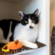 P.L.A.Y. Feline Frenzy Halloween Menacing Mice Toy Set - orange mouse sittng next to black and white cat in a cubby