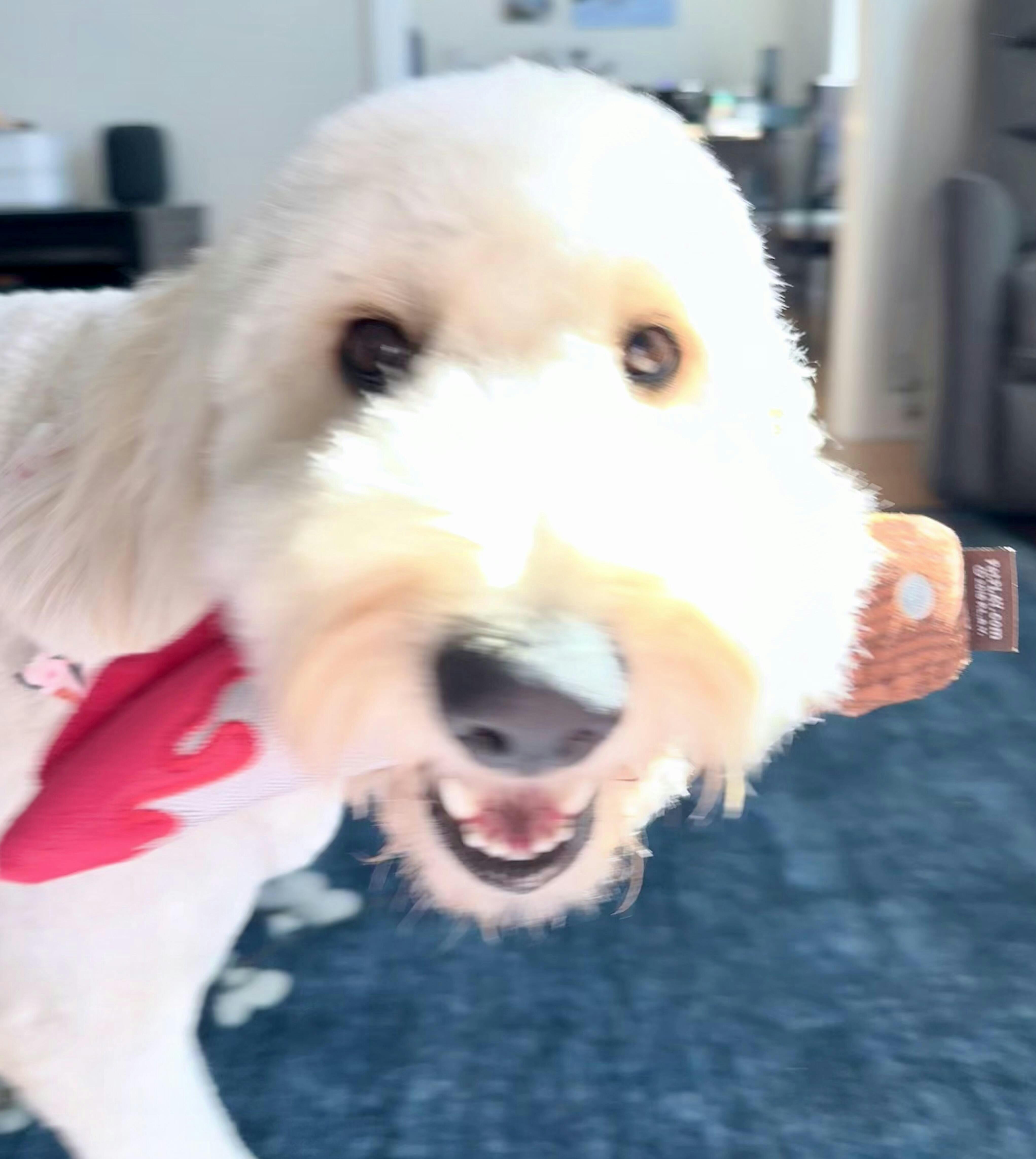 Running (but it’s tiny and safe!) With Knives puppy had a great time with this but honestly, the humans enjoyed it the best. We have a 60lb, 1.5yr so it was on the smaller side but still hilarious when she was holding it “drippy” side out. It was a good size for her to hold on to, easy to squeak and she was so delighted hearing us laugh at her and pranced around with it.
