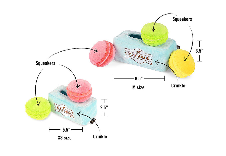 This toy is super high-quality and built to last! Both macarons squeak, and my little pup goes wild every time. The box is perfect for him to grab and carry around—he even runs laps with it! Such a fun toy, and definitely a hit in our house!